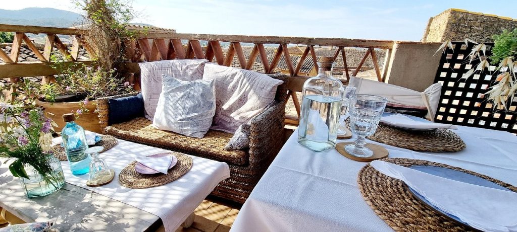 Desde su terraza, los huéspedes pueden disfrutar de vistas panorámicas sobre los tejados de Pals, con las montañas de Begur y las Islas Medas en el horizonte