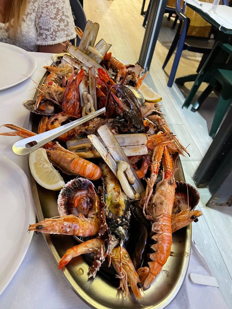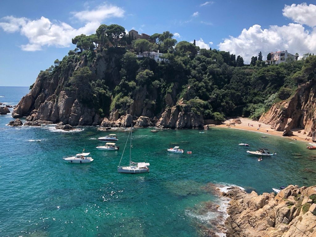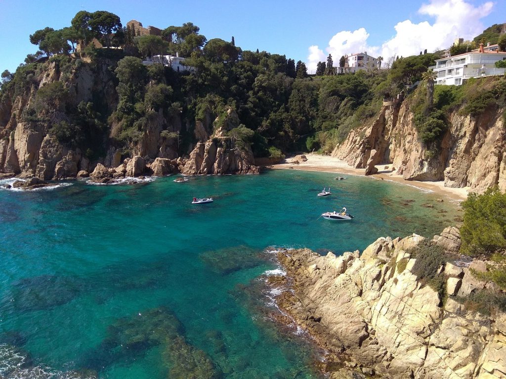 gastronomía local con pescado fresco del puerto de Blanes, el jardín Botánico Marimurtra las mejores vistas desde el Castillo de Sant Joan y la larguísima playa de S’Abanell con la mítica roca de  Sa Palomera (foto de vistas desde Sa Palomera).
